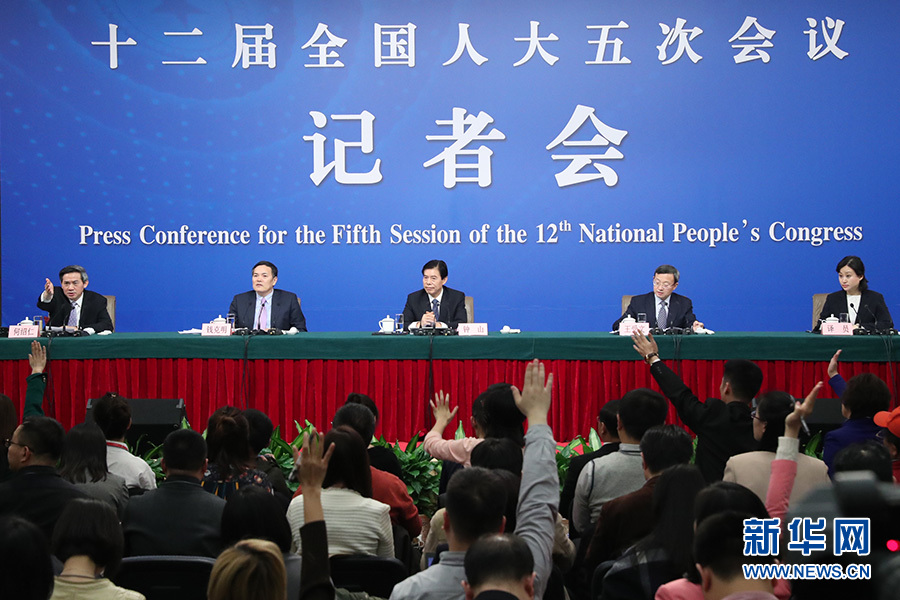 3月11日,十二届全国人大五次会议新闻中心举行记者会,主题是“改革开放调结构 创新驱动促发展”,商务部部长钟山、副部长王受文、副部长钱克明出席并回答中外记者的提问。图为记者会现场。 新华网/中国政府网 傅义洲 摄