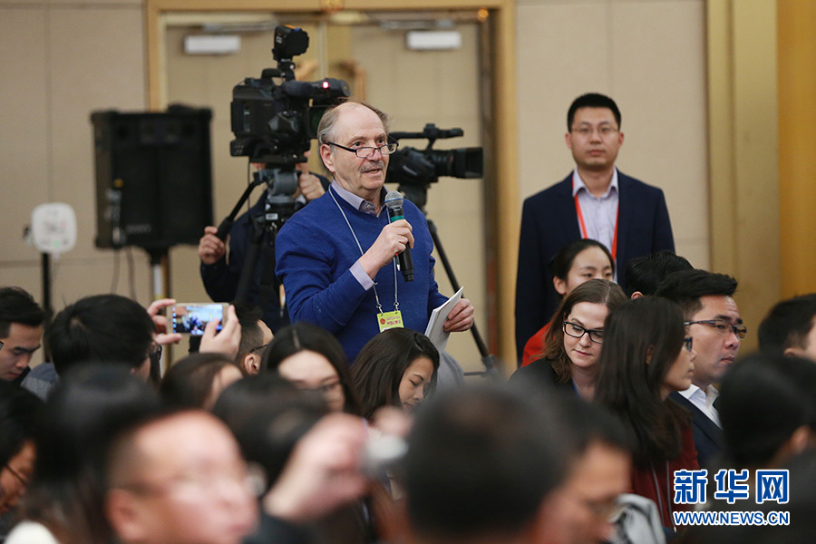3月11日,十二届全国人大五次会议新闻中心举行记者会,邀请工业和信息化部部长苗圩、副部长辛国斌和总工程师、新闻发言人张峰就“推进实施‘中国制造2025’”的相关问题回答中外记者的提问。图为德国世界报记者提问。新华网/中国政府网 傅义洲 摄