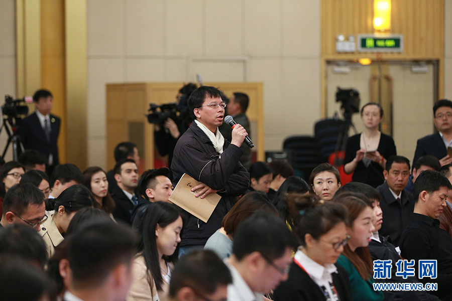 3月11日,十二届全国人大五次会议新闻中心举行记者会,邀请工业和信息化部部长苗圩、副部长辛国斌和总工程师、新闻发言人张峰就“推进实施‘中国制造2025’”的相关问题回答中外记者的提问。图为台湾旺旺中时媒体集团工商时报记者提问。新华网/中国政府网 傅义洲 摄