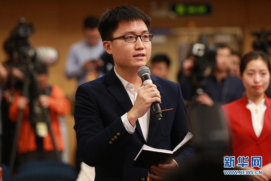 3月11日,十二届全国人大五次会议新闻中心举行记者会,邀请科技部部长万钢、秘书长徐建培就“2016年创新驱动发展战略实施进展成效和2017年重点工作”的相关问题回答中外记者的提问。图为新华社记者提问。新华网/中国政府网 王健 摄