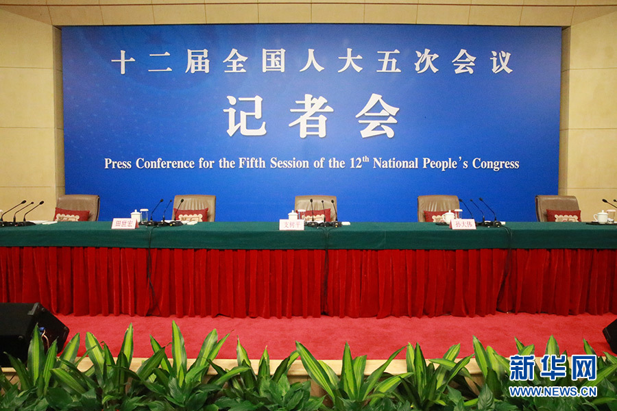3月14日,十二届全国人大五次会议新闻中心举行记者会,邀请国家质检总局局长支树平、副局长兼国家认证认可监督管理委员会主任孙大伟、国家标准化管理委员会主任田世宏就“质量提升”的相关问题回答中外记者的提问。图为记者会现场。新华网/中国政府网 傅义洲 摄