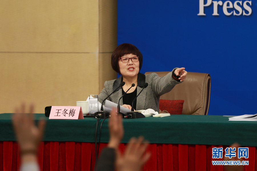 3月14日,十二届全国人大五次会议新闻中心举行记者会,邀请国家质检总局局长支树平、副局长兼国家认证认可监督管理委员会主任孙大伟、国家标准化管理委员会主任田世宏就“质量提升”的相关问题回答中外记者的提问。图为记者会主持人王冬梅。新华网/中国政府网 傅义洲 摄