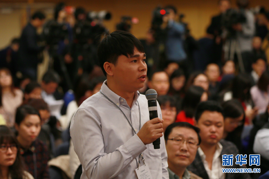 3月14日,十二届全国人大五次会议新闻中心举行记者会,邀请国家质检总局局长支树平、副局长兼国家认证认可监督管理委员会主任孙大伟、国家标准化管理委员会主任田世宏就“质量提升”的相关问题回答中外记者的提问。图为光明日报记者提问。新华网/中国政府网 傅义洲 摄