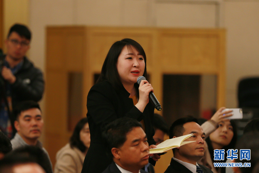 3月14日,十二届全国人大五次会议新闻中心举行记者会,邀请国家质检总局局长支树平、副局长兼国家认证认可监督管理委员会主任孙大伟、国家标准化管理委员会主任田世宏就“质量提升”的相关问题回答中外记者的提问。图为中国国际广播电台记者提问。新华网/中国政府网 傅义洲 摄