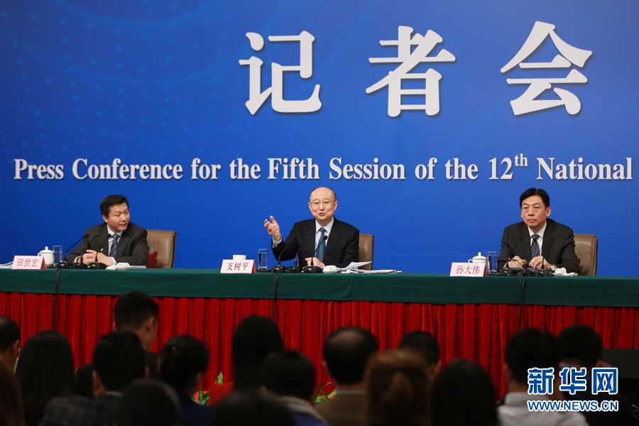 3月14日,十二届全国人大五次会议新闻中心举行记者会,邀请国家质检总局局长支树平、副局长兼国家认证认可监督管理委员会主任孙大伟、国家标准化管理委员会主任田世宏就“质量提升”的相关问题回答中外记者的提问。图为记者会现场。新华网/中国政府网 傅义洲 摄
