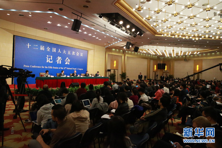 3月14日,十二届全国人大五次会议新闻中心举行记者会,邀请国家质检总局局长支树平、副局长兼国家认证认可监督管理委员会主任孙大伟、国家标准化管理委员会主任田世宏就“质量提升”的相关问题回答中外记者的提问。图为记者会现场。新华网/中国政府网 傅义洲 摄