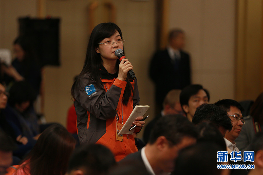 3月14日,十二届全国人大五次会议新闻中心举行记者会,邀请国家质检总局局长支树平、副局长兼国家认证认可监督管理委员会主任孙大伟、国家标准化管理委员会主任田世宏就“质量提升”的相关问题回答中外记者的提问。图为扬子晚报记者提问。新华网/中国政府网 傅义洲 摄