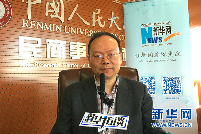 15日上午,民法总则草案表决通过,中国人民大学法学院教授、中国民法学研究会秘书长王轶接受本网专访解读。(新华网实习生杨怡然摄)