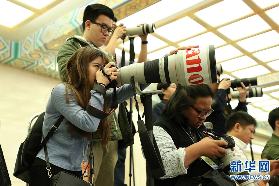 3月15日上午,国务院总理李克强在人民大会堂三楼金色大厅会见采访十二届全国人大五次会议的中外记者并回答记者提出的问题。图为记者会现场的摄影记者。新华网/中国政府网 翟子赫 摄