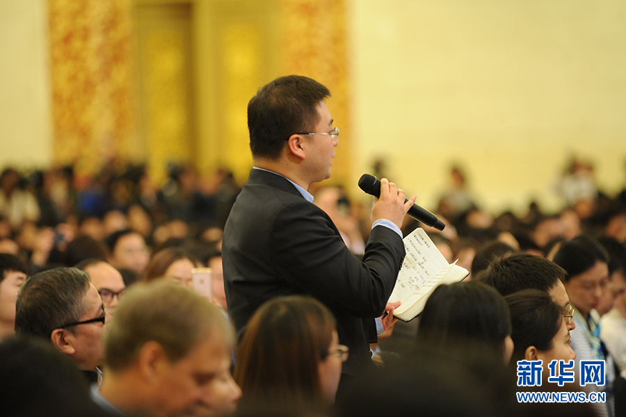 3月15日上午,国务院总理李克强在人民大会堂三楼金色大厅会见采访十二届全国人大五次会议的中外记者并回答记者提出的问题。图为中央人民广播电台记者提问。新华网/中国政府网 翟子赫 摄