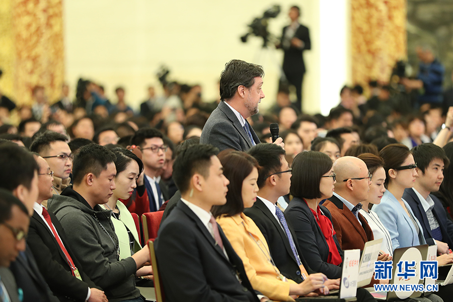 3月15日上午,国务院总理李克强在人民大会堂三楼金色大厅会见采访十二届全国人大五次会议的中外记者并回答记者提出的问题。图为美国有线电视新闻网记者提问。新华网/中国政府网 翟子赫 摄