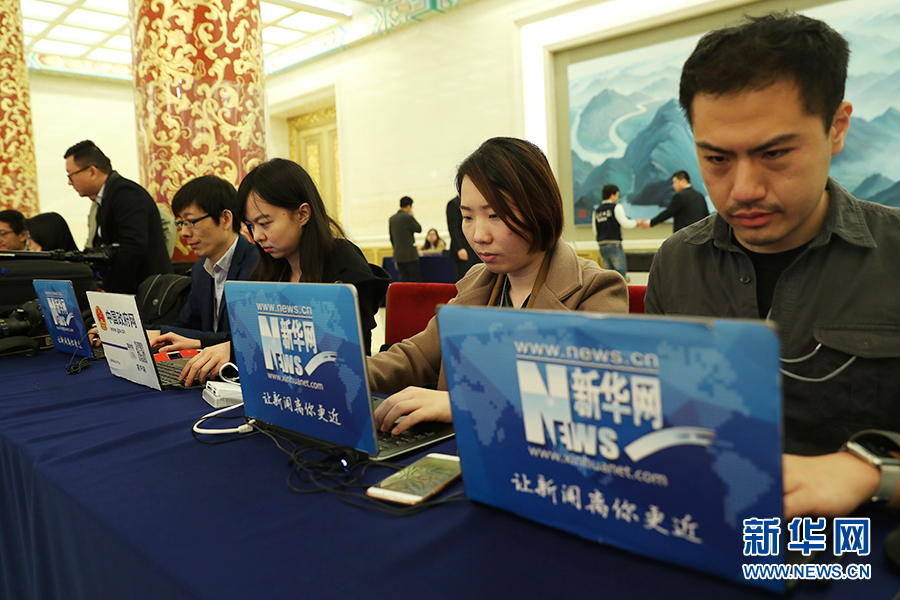 3月15日上午,国务院总理李克强在人民大会堂三楼金色大厅会见采访十二届全国人大五次会议的中外记者并回答记者提出的问题。图为新华网记者在做直播准备。新华网/中国政府网 翟子赫 摄