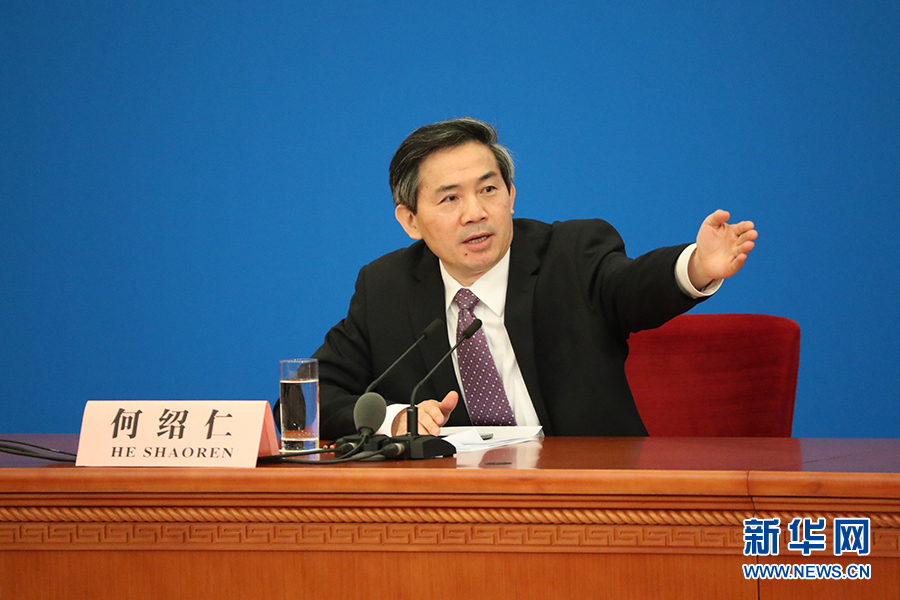 3月15日上午,国务院总理李克强在人民大会堂三楼金色大厅会见采访十二届全国人大五次会议的中外记者并回答记者提出的问题。图为记者会主持人何绍仁。新华网/中国政府网 孙韬 摄
