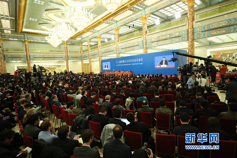 3月15日上午,国务院总理李克强在人民大会堂三楼金色大厅会见采访十二届全国人大五次会议的中外记者并回答记者提出的问题。图为记者会现场。新华网/中国政府网 翟子赫 摄