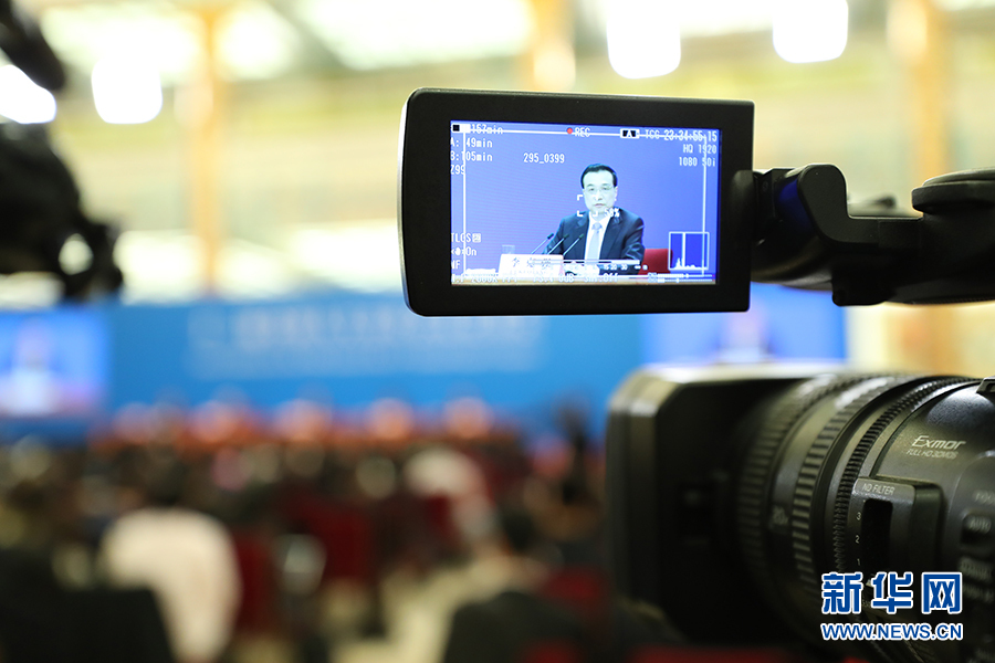 3月15日上午,国务院总理李克强在人民大会堂三楼金色大厅会见采访十二届全国人大五次会议的中外记者并回答记者提出的问题。图为记者会现场。新华网/中国政府网 翟子赫 摄