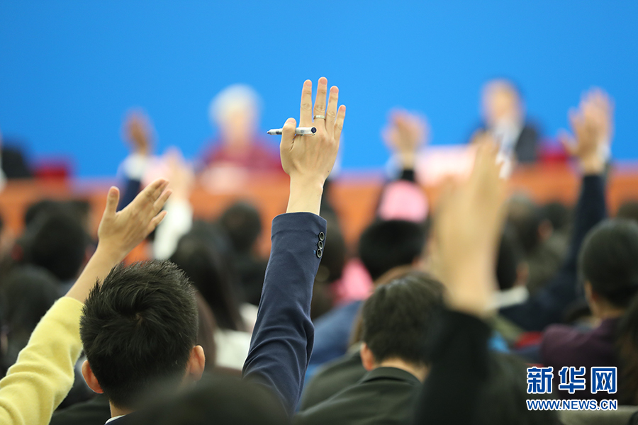 3月15日上午,国务院总理李克强在人民大会堂三楼金色大厅会见采访十二届全国人大五次会议的中外记者并回答记者提出的问题。图为记者踊跃提问。新华网/中国政府网 孙韬 摄