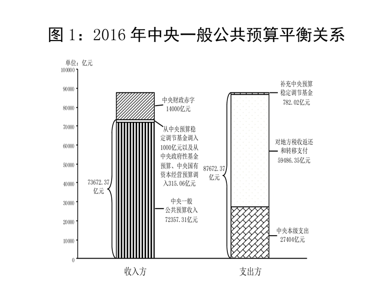中央一般公共预算收入72357.31亿元,为调整预算的100%,比2015年同口径增长1.2%。加上从中央预算稳定调节基金调入1000亿元,从中央政府性基金预算、中央国有资本经营预算调入315.06亿元,收入总量为73672.37亿元。中央一般公共预算支出86890.35亿元(其中,中央本级支出27404亿元,中央对地方税收返还和转移支付59486.35亿元),完成调整预算的99.1%,增长4.5%。加上补充中央预算稳定调节基金782.02亿元,支出总量为87672.37亿元。收支总量相抵,中央财政赤字14000亿元,与预算持平。2016年中央预备费预算500亿元,实际支出146.1亿元,剩余353.9亿元全部转入中央预算稳定调节基金。2016年末,中央财政国债余额120066.75亿元,控制在年度预算限额125908.35亿元以内;中央预算稳定调节基金余额2678.06亿元(含通过收回中央财政结转资金补充1501.83亿元)。