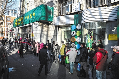 中国邮政工体北路邮政支局门口,市民排队购买邮票。