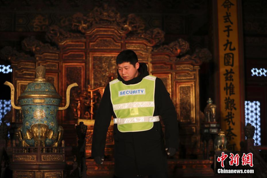 12月31日,北京故宫博物院单霁翔院长带领负责开放管理工作的约700名职工,对北京故宫博物院开放区域进行了2017年最后一次清场封门检查,标志着北京故宫博物院一年来开放工作的圆满顺利完成,2017年北京故宫共接待游客近1670万人次。清场封门检查是北京故宫博物院每天开放工作的最后一个环节,清场封门检查的主要任务是及时发现和消除安全隐患,检查古建筑有无受损情况,开放设施有无损坏情况,有无滞留的观众或隐藏的不法分子,有无藏匿的危险物品等。图为工作人员在太和殿内检查。中新社记者 杜洋 摄