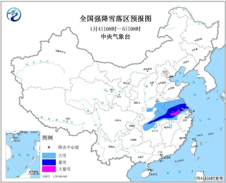 据中央气象台网站消息,中央气象台1月4日06时继续发布暴雪橙色预警:预计,4日08时至5日08时,河南中南部、湖北中东部、湖南西北部、安徽大部、江苏大部等地有大到暴雪,其中,安徽中部、江苏西南部等地局地有大暴雪(20~30毫米)。上述地区新增积雪深度5~10厘米,局地可达15~20厘米。另外,湖南西北部、贵州东北部局地有冻雨。