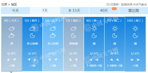 今天气温将处于冰点以下,明起稍有回升。北京市气象台预计,今晨上班时多云,北转南风二三间四级,-5~-3℃;白天多云转阴,北转南风二三间四级,最高气温仅0℃,为本周最低点;夜间阴转多云,西部山区有零星小雪,南转北风一二级,最低气温-8℃,昼夜温差达到8℃。明天开始至周日最高气温将回升到2~3℃,但到下周初又将再次回落至冰点。