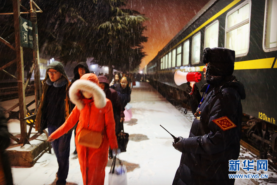 1月3日,洛阳渑池车站客运值班员马火军组织旅客安全有序出站。(郑州铁路局供图,新华网发)