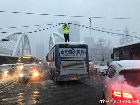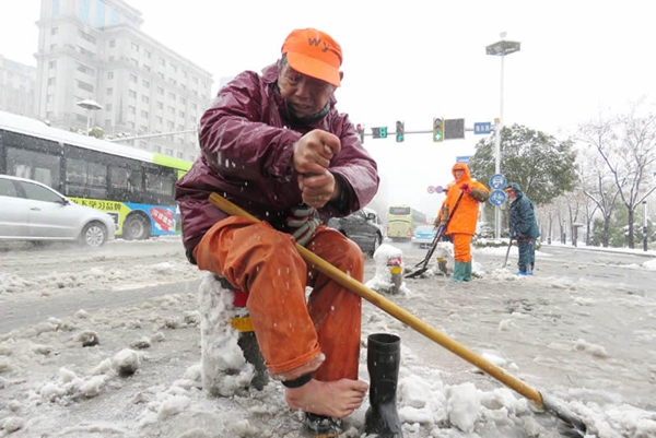 通讯电缆被压落导致交通瘫痪 执勤协警爬上公交车顶 用双手托举电缆线10多分钟 城管 暖心! 南京城管扫雪打通道路 两岁小女孩跑过来说“谢谢叔叔” 环卫工人 拧干湿透的袜子