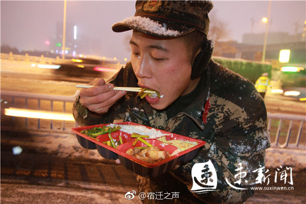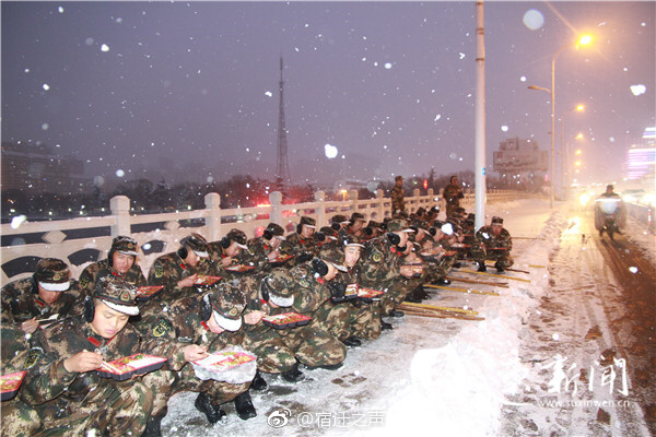 官兵们在暴雪中紧急就餐