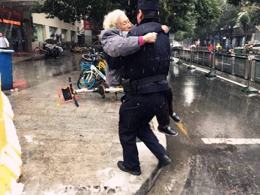 民警将老人抱起抬上警车送往医院医治