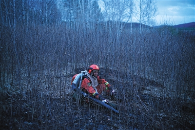 5月4日19时许,武警内蒙古大兴安岭森林支队杨涛在救灾时转场,途中在路边休息。三天来他和战友已转战5个火场。新京报首席记者 陈杰 摄