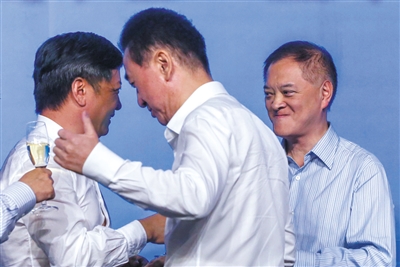 7月19日,王健林(中)、孙宏斌(左)、李思廉(右)举杯庆祝。当日原本是万达、融创双方的战略合作突然变成了万达、融创、富力三方举行战略合作签约仪式。新京报记者 浦峰 摄