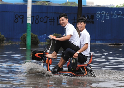 6月23日,受大雨影响燕郊创意古街中段积水深约25公分,两名男子骑电动车通过约500米积水路段。 新京报记者 王飞 摄