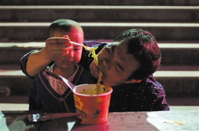 8月9日,受九寨沟地震影响,滞留的游客和外来务工人员被安置在文化广场。一对爷孙在安置点吃晚餐。新京报记者 王飞 摄