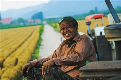 6月13日,山东省泰安市汶阳县农村,收割完的麦客刘中晨坐在机器上咧着嘴笑,“虽然今天就割了两三亩田,但只要能挣钱就开心”。 新京报记者 彭子洋 摄