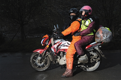 1月18日晚,贵州六枝特区,牟安虎和妻子骑行到家门口。新京报记者 吴江 摄