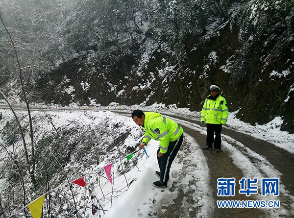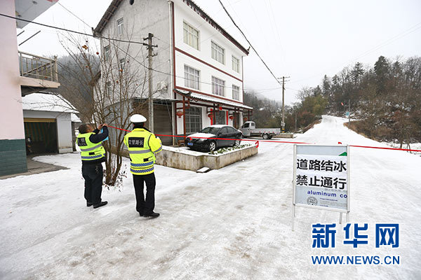 因道路坡陡,路面结冰,湖北五峰土家族自治县“路长”朱汉军(左)和袁乐军(右)在刘家坳路段拉起简易警戒线(1月5日摄)。新华社记者 王自宸 摄