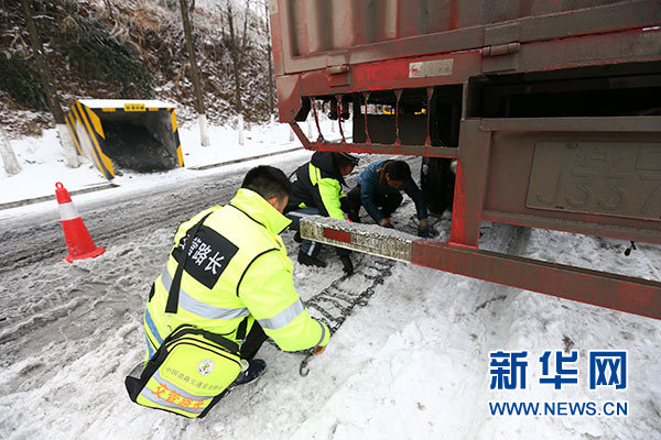 湖北五峰土家族自治县仁和坪镇“路长”高恩强(左一)在杨柳池村到金家垴路段指导过往货车安装防滑链(1月5日摄)。新华社记者 王自宸 摄