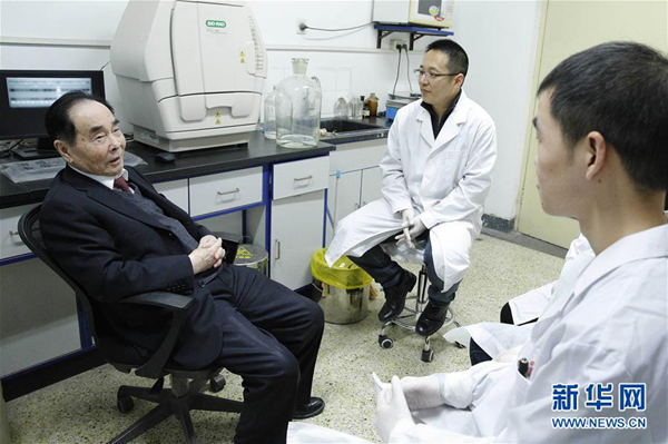 侯云德院士(左)在实验室与学生交流(2017年12月27日摄)。新华社记者 张玉薇 摄