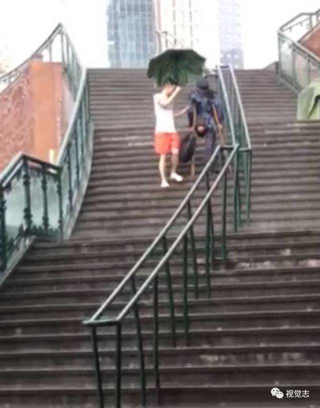下雨天,人们匆匆赶路,一个小哥哥在帮一个乞讨老人撑伞,慢慢扶他下楼梯。