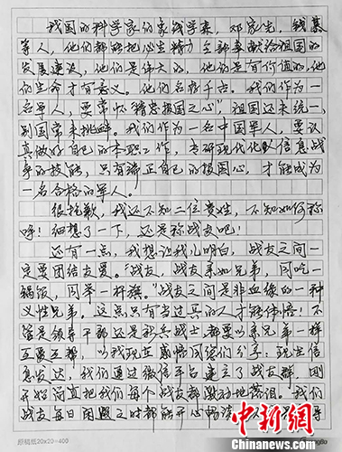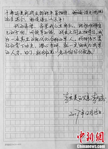 家书的最后,李有志写道:“希望儿子成为一名真正的现代化合格军人,只要你们肯下功夫,潜心专研,就一定能成为我军人才。老兵向你们致敬!”(王佳昕)