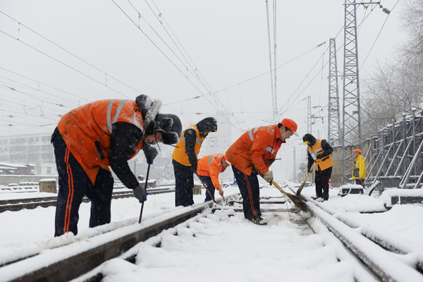 武汉铁路局信阳车站以雪为令,24小时不间断清扫道岔上的积雪,做到随下随扫、雪大勤扫,全力确保京广、宁西枢纽畅通。