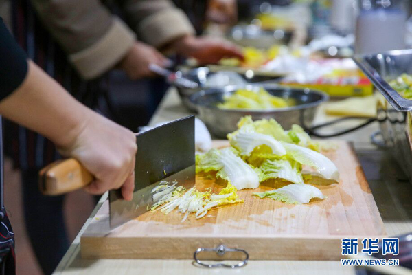 1月11日,山西太原,来自桥东街道的居民和志愿者,在厨师的指导下,正在为该区域需要帮助的老人、残疾人等制作午餐,为他们送去温暖。