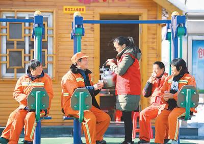 图为一月十日,安徽省肥西县环卫工人在“爱心小屋”前喝热水、晒太阳。新华社记者 刘军喜摄