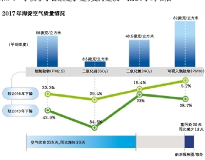 据记者了解,2017年,海淀PM2.5年均浓度为56微克/立方米,空气质量位居城六区首位;较2016年同比下降22.2%,排名全市第五位;较清洁空气行动开始的2013年下降42.9%,累计改善幅度位居全市第三位。