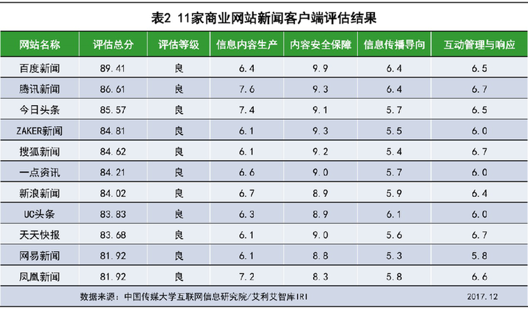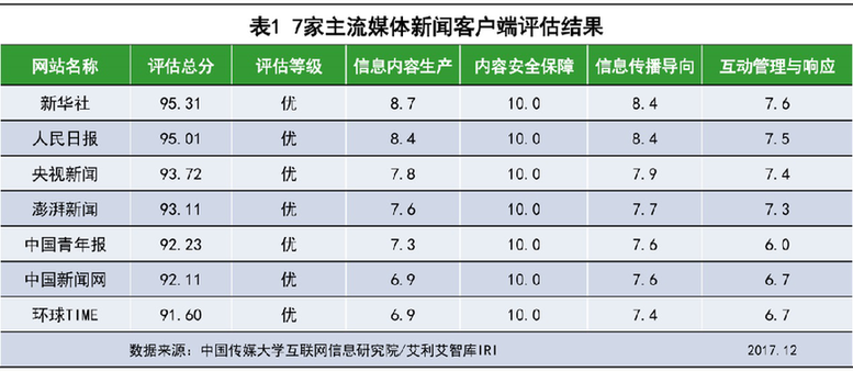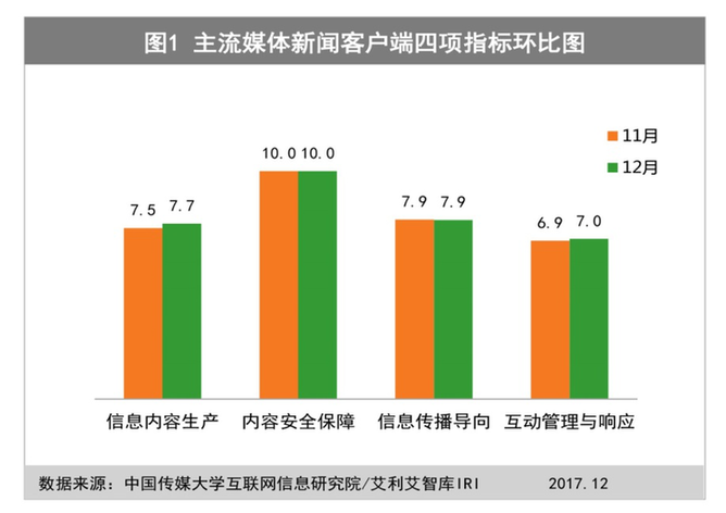 新华网北京1月17日电 1月16日,中国传媒大学互联网信息研究院发布《新闻客户端信息生态指数2017年12月榜》。评估结果显示,主流媒体新闻客户端总体生态优,商业网站新闻客户端总体生态良。2017年12月,各新闻客户端信息生态主要呈现以下特点: