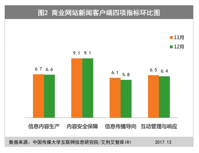 与11月相比,主流媒体新闻客户端两项指标有小幅提升。在信息内容生产、互动管理与响应方面,主流媒体新闻客户端较上月略有提升,内容安全保障、信息传播导向与上月持平,四项指标较上月变化情况如下图: