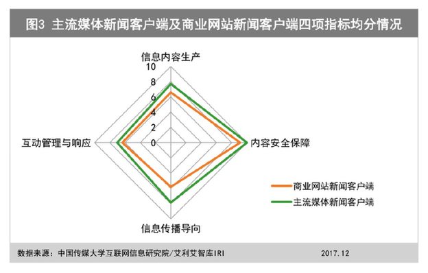 主流媒体新闻客户端四项指标均优于商业网站新闻客户端。在信息传播导向方面,商业网站新闻客户端与主流媒体新闻客户端差距较大;内容安全保障方面,商业网站新闻客户端还需加强;两类客户端均需进一步提高互动管理与响应。