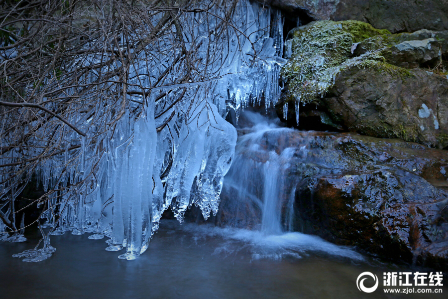 近日,受低温影响,海拔800米的余姚四明山鹁鸪岩溶洞瀑布结起冰瀑。(浙江在线 拍友 周耀辉 摄)