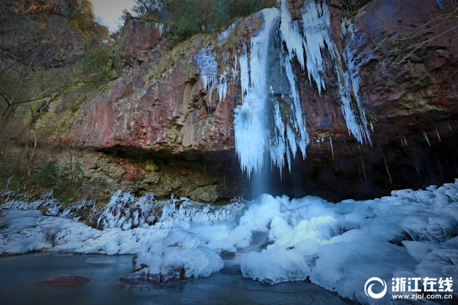 近日,受低温影响,海拔800米的余姚四明山鹁鸪岩溶洞瀑布结起冰瀑。(浙江在线 拍友 周耀辉 摄)