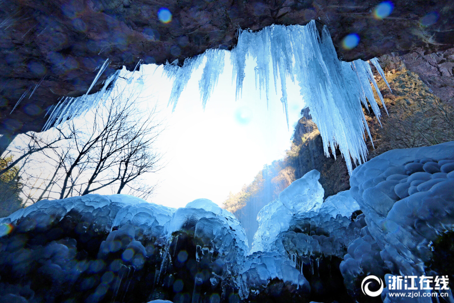 近日,受低温影响,海拔800米的余姚四明山鹁鸪岩溶洞瀑布结起冰瀑。(浙江在线 拍友 周耀辉 摄)